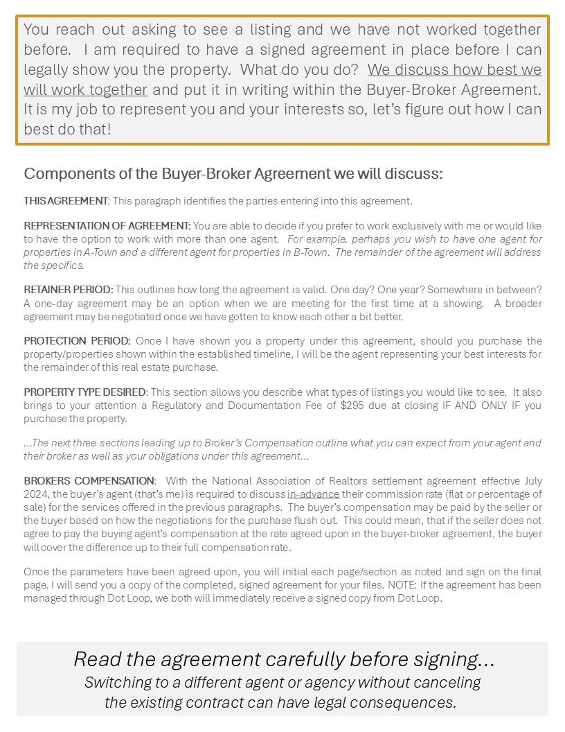 You will be asked to enter into a written buyer agreement with your real estate professional before “touring” a home with them, either in-person or virtually. If you are simply visiting an open house on your own or asking a real estate professional about their services, you do not need to sign a written buyer agreement.